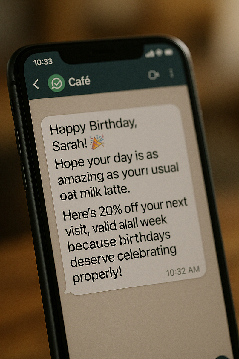 Imagine receiving a personal birthday message from your favourite coffee shop, complete with a special offer just for you. Not a generic “Happy Birthday” blast, but a message that references your usual order and includes a meaningful discount.