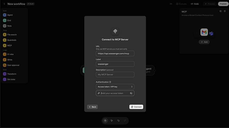 Once connected, you can use the MCP tools in your ChatGPT agent workflows. The agent will automatically have access to all Wassenger WhatsApp tools and can execute them based on your instructions.