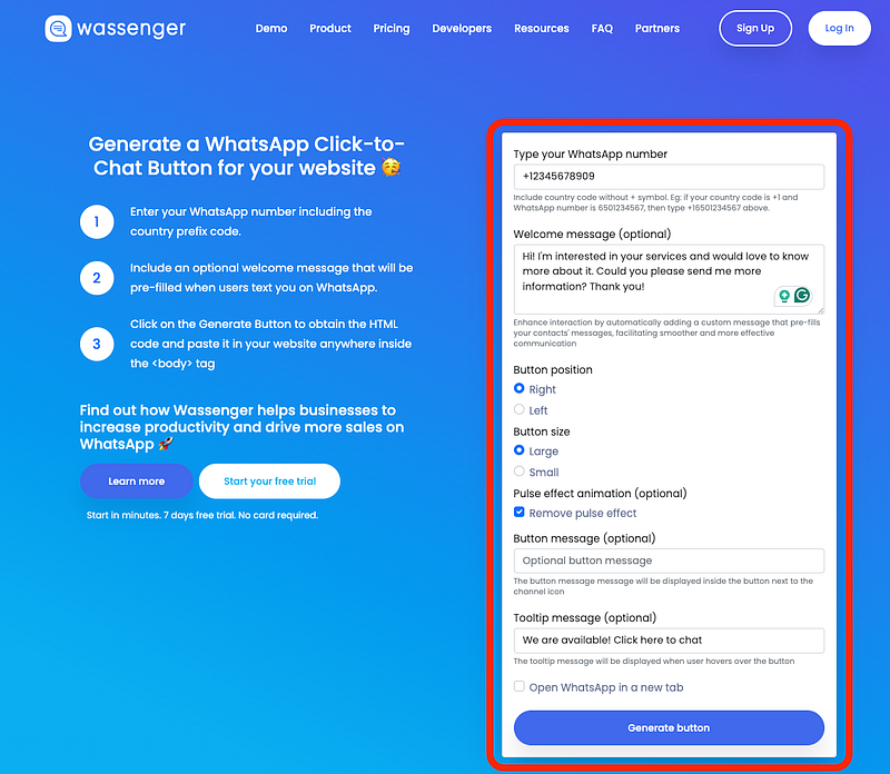 By integrating the Wassenger WhatsApp button on your website, you provide a direct, fast, and familiar communication channel for potential clients. This simple addition can significantly increase customer engagement, foster trust, and ultimately drive more sales by making your business readily accessible to answer inquiries or close deals.