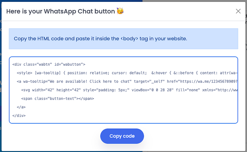 Now, to embed your new WhatsApp button widget, you need to visit our dedicated page here and generate the code for the integration. Don’t worry! You won’t need to change anything. The code is ready to use :)