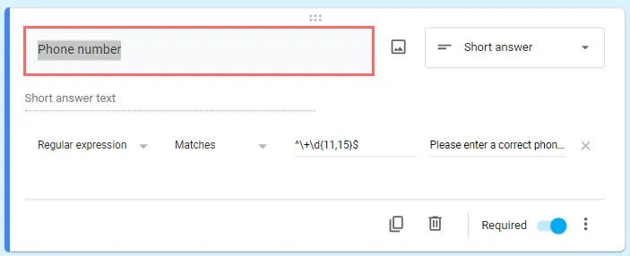 We employ the following regular expression for this purpose: ^+d{11,15}$ This is used in the phone number field of our Google Form as shown in the image below.