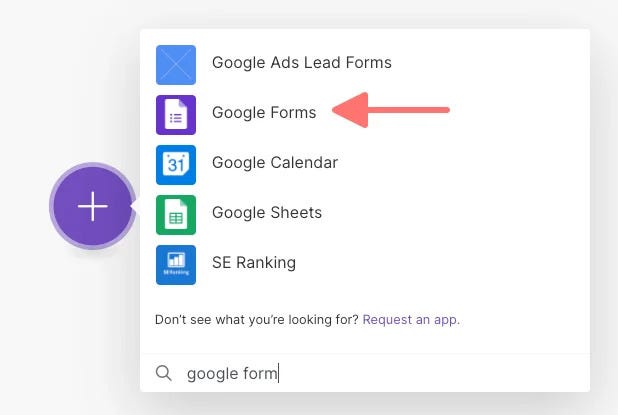 In your new scenario click on the big Plus (+) sign in the purple circle, for easy finding, write Google Forms in the search box and then choose Google Forms
