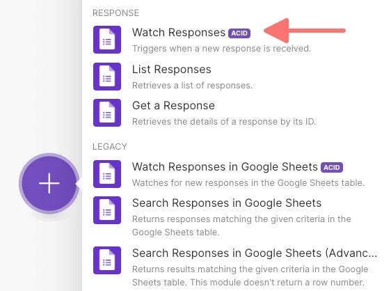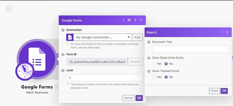 Now, let’s incorporate the Google Forms module into our workflow. We’ll select the “Watch Responses” event, which allows us to keep track of new form submissions, selection of the form is simple, just click the Search button and the list of your forms will show up.