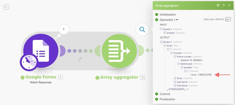 Additionally, we need to establish a connection with the Array Aggregator module. This step is crucial because, by using the Array Aggregator module, we can conveniently convert the collection of responses received from Google Forms into an array. This conversion will make it much easier for us to utilize the data in our upcoming steps.
