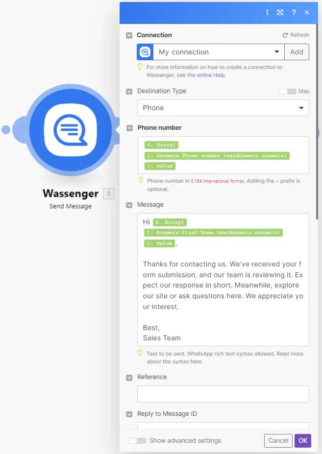 We’ll examine the Array Aggregator Module to see how data is arriving from the Google Form as an array. This allows us to use these values in any following module. In our instance, we’ll be integrating this data into the Create Contact event in the Wassenger Module, next picture shows you how to configure the module.