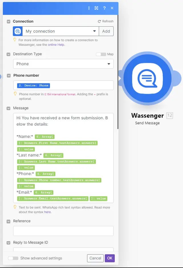 It’s important to note here that we’re selecting our phone number from the Wassenger Module Device section.