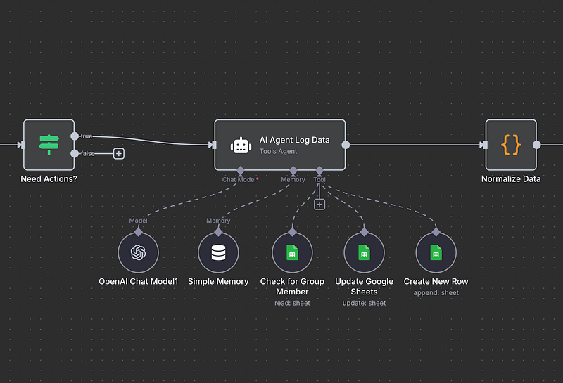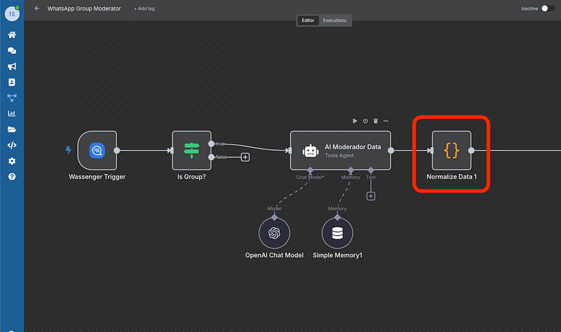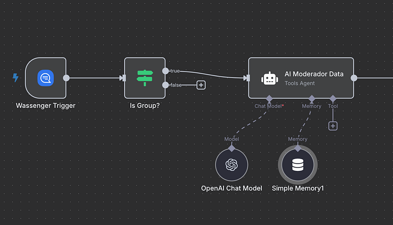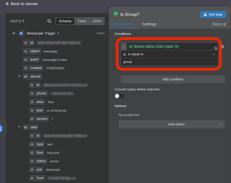 Add an If node to ensure you’re only processing group messages, not direct messages. This simple filter checks if the chat type equals “group”, keeping your automation focused on what matters.