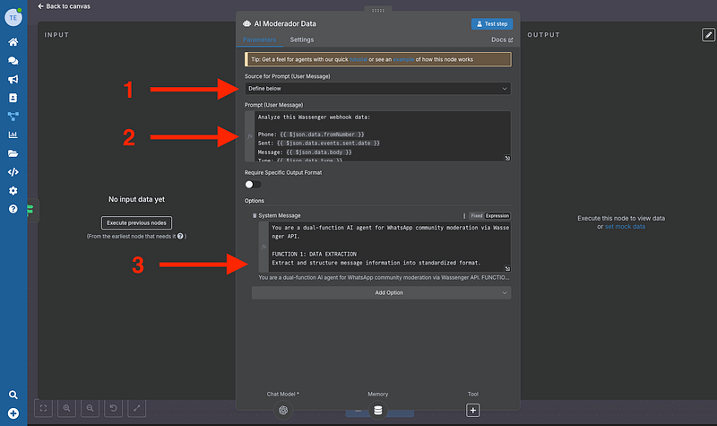 Here’s where the magic happens. Connect an OpenAI Chat Model node configured with GPT-5. This AI agent analyses each message for: