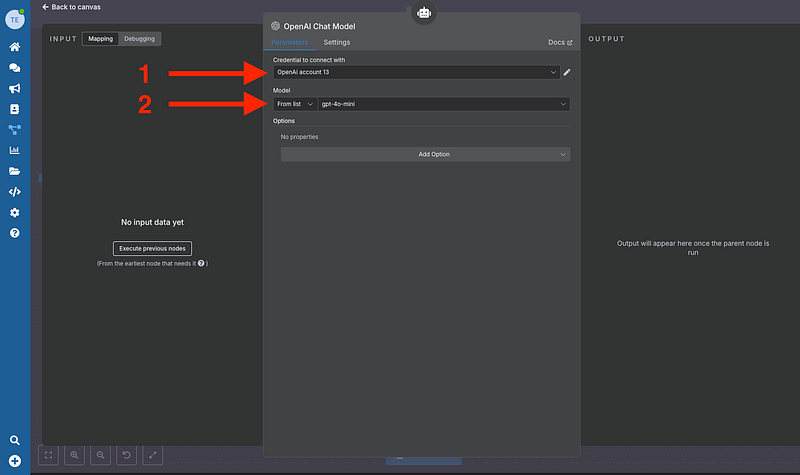 Add the AI agent and the OpenAI Chat Model + Simple Memory