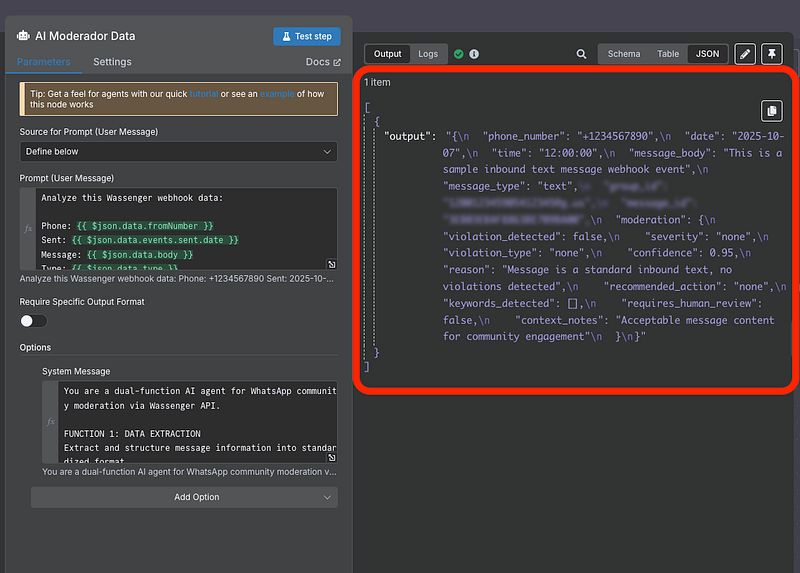 { "phone_number": "string with country code (from fromNumber)", "date": "YYYY-MM-DD (from events.sent.date)", "time": "HH:mm:ss (from events.sent.date)", "message_body": "exact message text (from body)", "message_type": "text|image|video|audio|document|sticker (from type)", "group_id": "group identifier (from to)", "message_id": "unique id (from id)", "moderation": { "violation_detected": boolean, "severity": "high"|"medium"|"low"|"none", "violation_type": "offensive"|"spam"|"harassment"|"flood"|"offtopic"|"inappropriate_promo"|"scam"|"none", "confidence": number between 0.0 and 1.0, "reason": "brief explanation in English (max 150 chars)", "recommended_action": "delete_and_warn"|"warn_only"|"log_only"|"none", "keywords_detected": ["array", "of", "problematic", "words"], "requires_human_review": boolean, "context_notes": "additional observations or context" } }