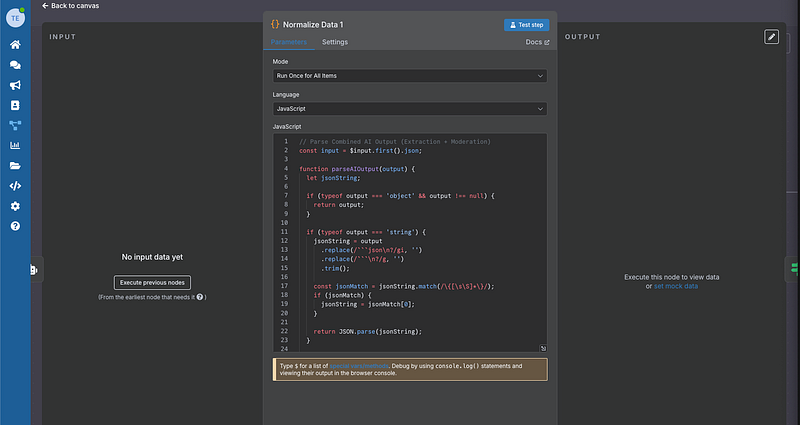 Add a Code node (labelled “Normalise Data 1”) that parses the AI’s JSON response and structures it for downstream processing.