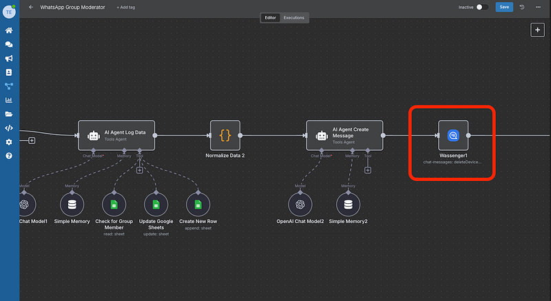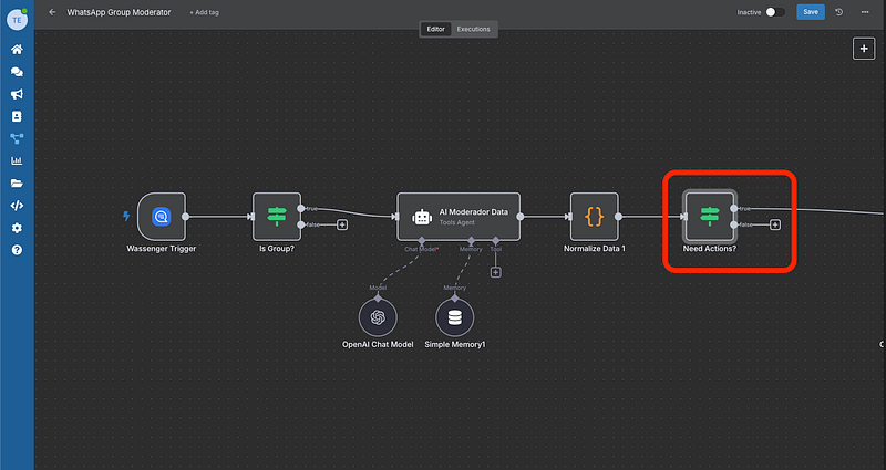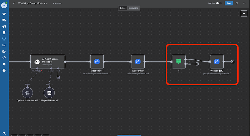 Add an If node that checks if should_remove is true (when strikes >= 3). If true, it triggers the final Wassenger action node that removes the member from the group using their phone number.