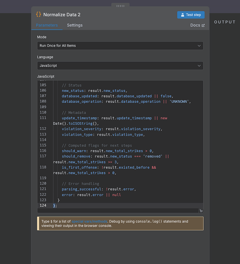 This node ensures clean data formatting, removes phone number prefixes for database consistency, and flattens the moderation results for easier access.