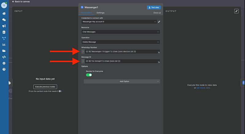 Add the Wassenger Node (Delete Message)