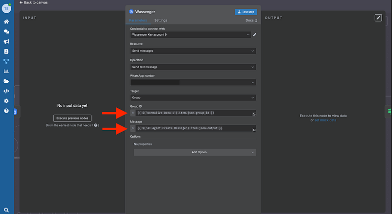 Add the Wassenger node (send-messages: sendText)