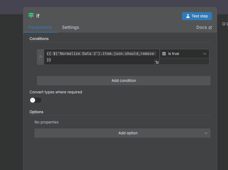 {{ $(‘Normalize Data 2’).item.json.should_remove }} is true