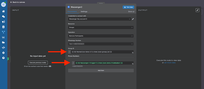 Now, add the Wassenger Node to delete the participant if true