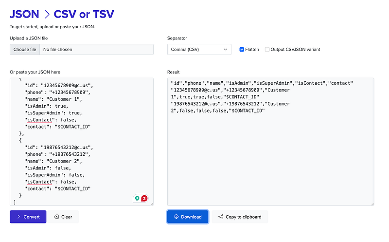 Now we have the provided JSON information about our group members, we can export this data to a CSV file using an online converter. You can use any reliable converter you want