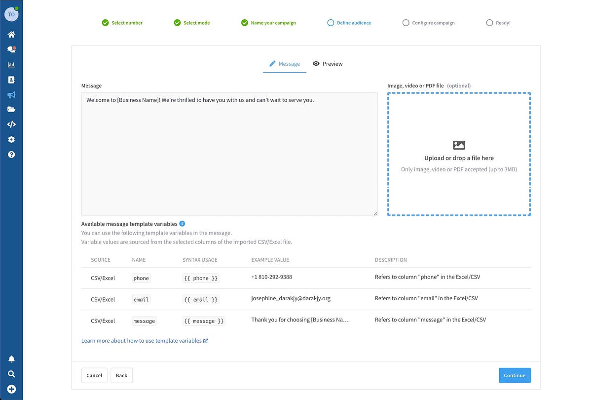 Create a campaign by importing a list of contacts from CSV / Excel / Google Sheets, or select contacts from the internal Wassenger CRM.