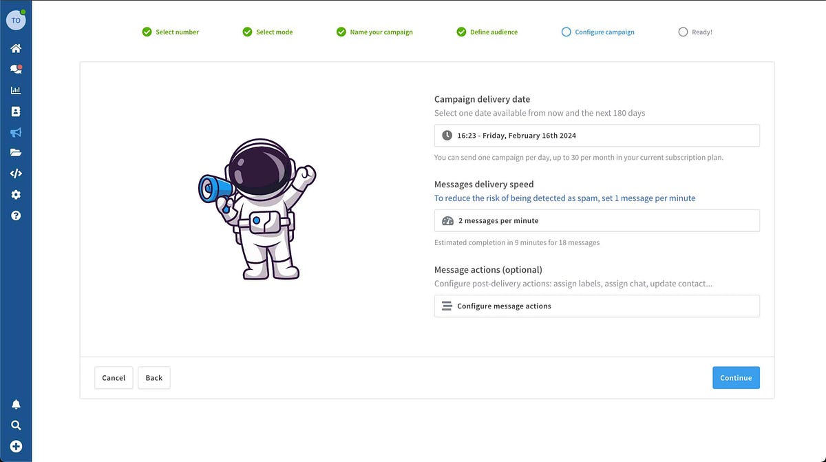 Set the campaign delivery time, messages delivery speed and optional automation actions and confirm!