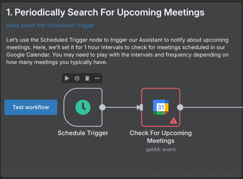 Start by adding a Schedule Trigger node to your n8n workflow, configuring it to run hourly. Connect it to a Google Calendar node to fetch upcoming meetings in the next hour. This creates the backbone of your automation — a system that regularly checks for upcoming meetings.