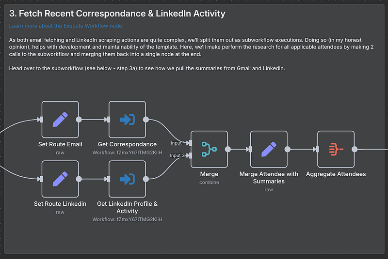 For email correspondence, add a Gmail node to find recent emails from each attendee.