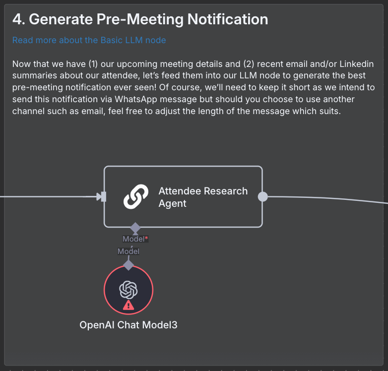 Add an OpenAI node to transform all this data into actionable insights. Feed it the meeting details, email correspondence, and LinkedIn activity. The AI will generate a personalised brief highlighting the most relevant points for your upcoming meeting.