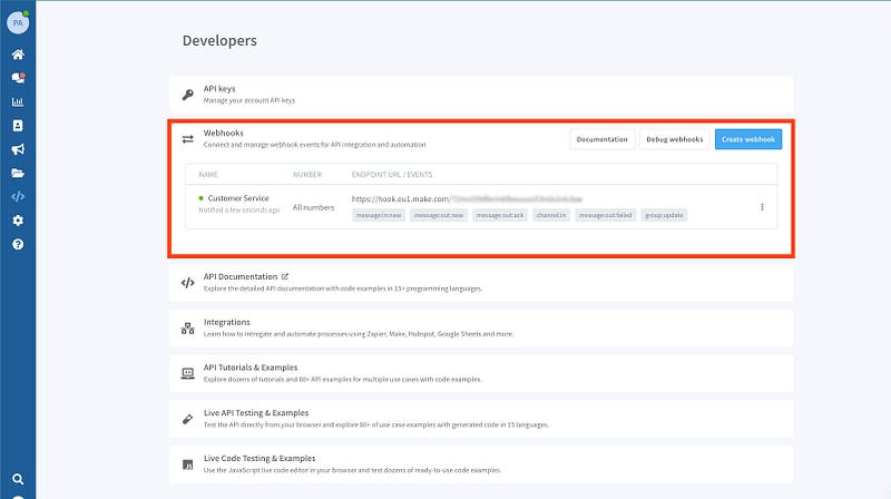 Now we need to open our Wassenger’s developers panel as shown in the image below: Left navbar > Developers > Webhooks > Create new webhook