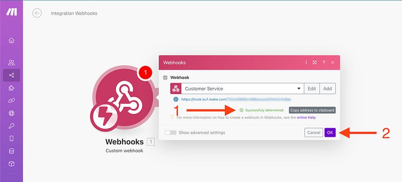 2. Add the given Make HTTPS address we obtained before (For production integrations, it is required to use HTTPS instead of HTTP since communication would be end-to-end secure and encrypted.)
