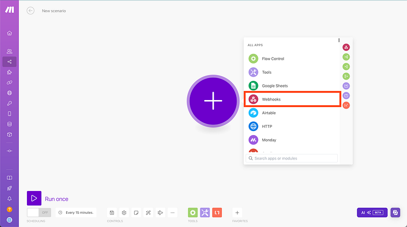 Step 2: Create a new scenario in Make to communicate with Wassenger