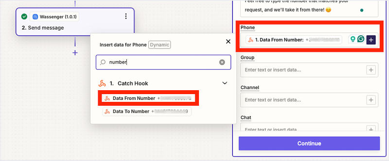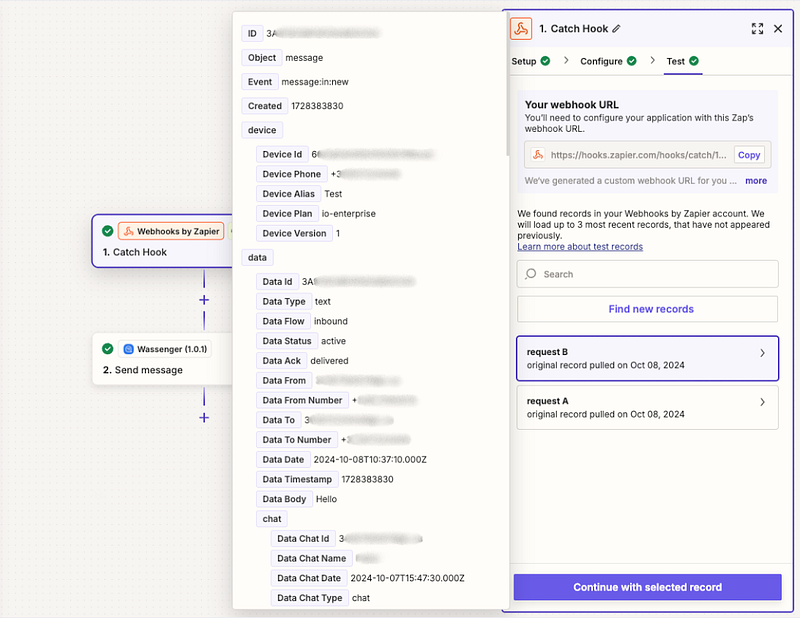 Zapier will create a request where you can see all the provided data from Wasseger when receiving messages from other WhatsApp numbers