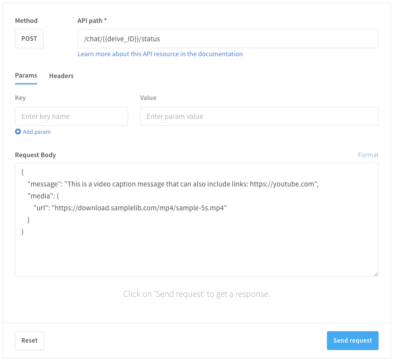 .body("{\"message\":\"This is a video caption message that can also include links: https://youtube.com\", \"media\":{\"url\":\"https://download.samplelib.com/mp4/sample-5s.mp4\"}}")