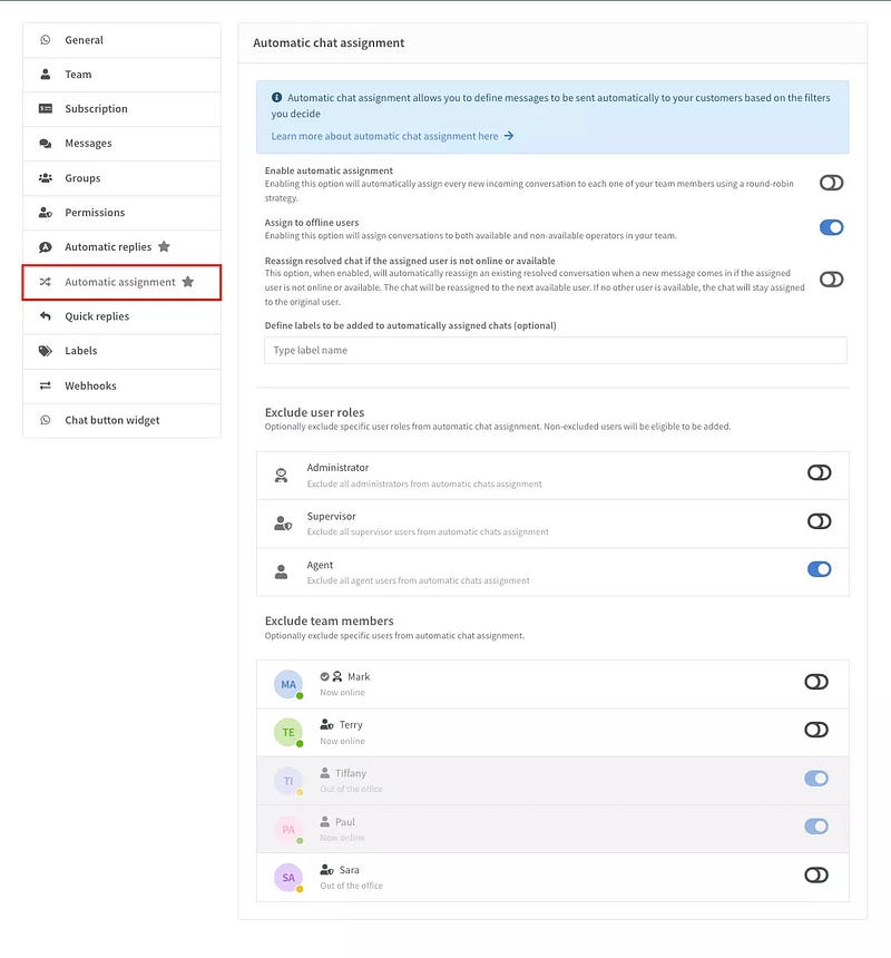 In the “Settings” section, locate the “Automatic chat assignment” toggle. Click on the toggle to enable automatic chat assignment. The toggle should turn blue when enabled.
