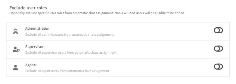 User role exclusion allows you to prevent specific user roles from being automatically assigned to chats, ensuring better control over chat distribution and team engagement.