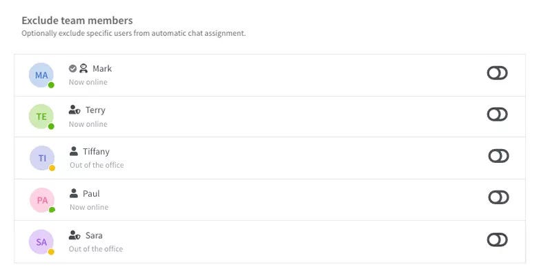 With this feature, you can selectively exclude individual users from being automatically assigned to chats.