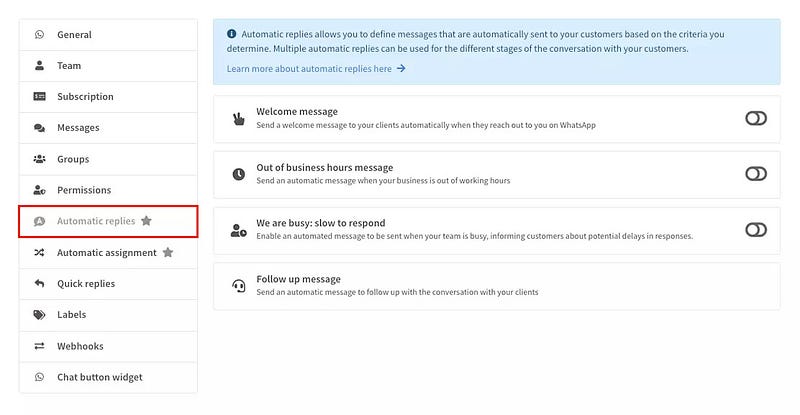 Firstly, WhatsApp Business has only two kinds of automatic replies: greetings and away messages. Our automatic replies tool offers follow-up messages as well, which are a potent asset for engaging with customers even after a conversation.