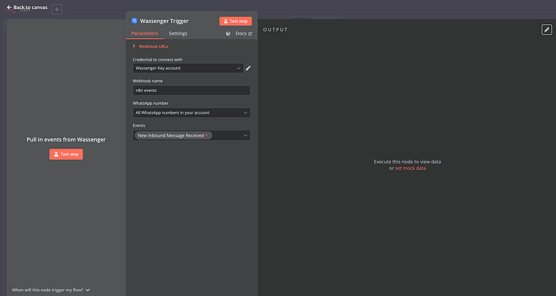 Use the Wassenger Trigger node to listen for incoming messages. This connects your n8n instance to your WhatsApp business number. The trigger captures both text and voice notes.