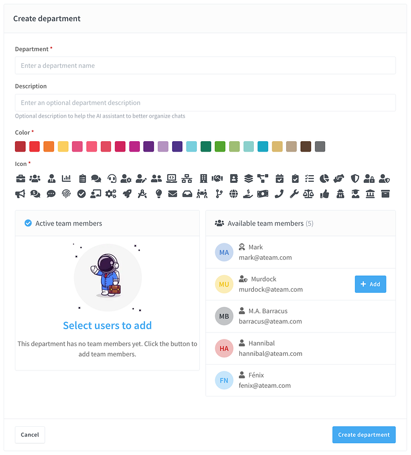 - Add up to 30 team members per department.