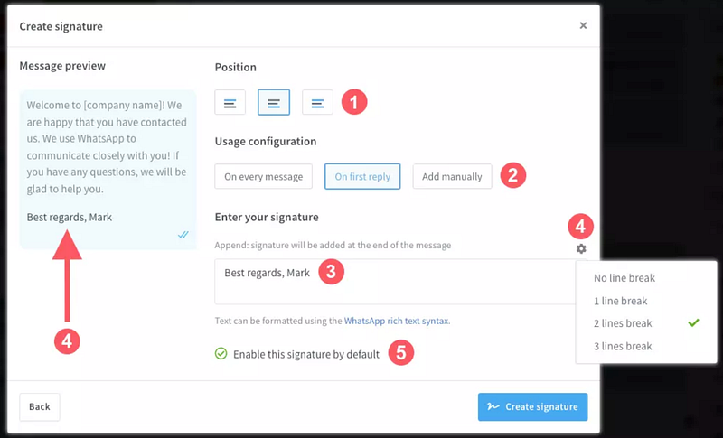 Follow these simple steps to create and customize your WhatsApp signatures:
