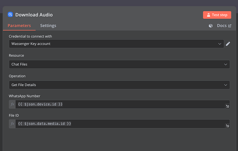 https://api.wassenger.com{{ $('Wassenger Trigger').item.json.data.media.links.download }} - Authentication: Generic Credential Type