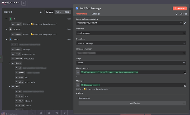 After sending a message to your connected WhatsApp number, you’ll observe something similar to this: