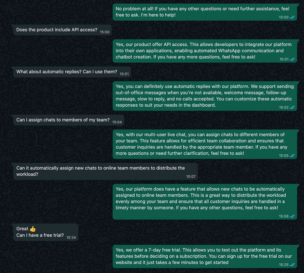 // Default help message. Change it as you need. const defaultMessage = `Don't be shy 😁 try asking anything to the AI chatbot, using natural language! Example queries: 1️⃣ Explain me what is Wassenger 2️⃣ Can I use Wassenger to send automatic messages? 3️⃣ Can I schedule messages using Wassenger? 4️⃣ Is there a free trial available? Type *human* to talk with a person. The chat will be assigned to an available member of the team. Give it a try! 😁`