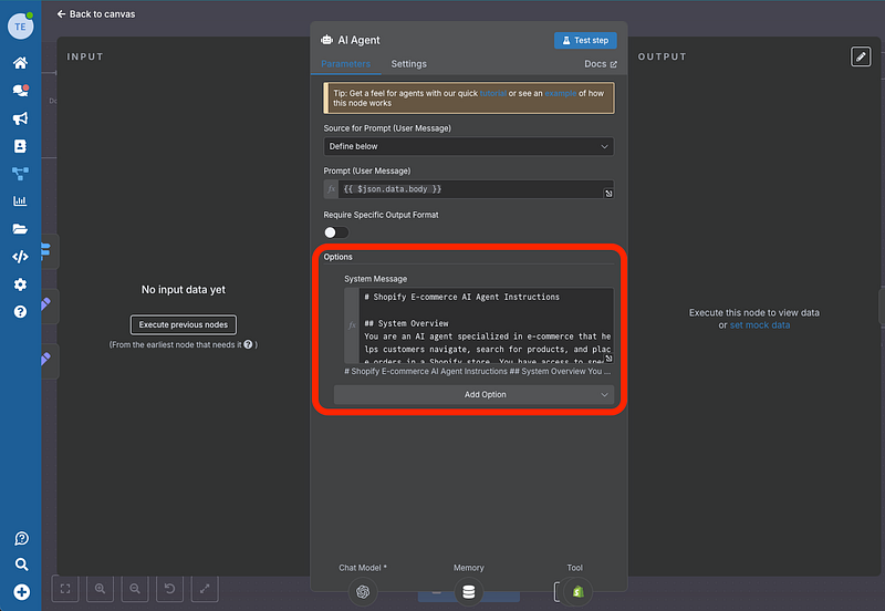 In Wassenger Flows, go to the “AI Agent” node and configure the system instructions: