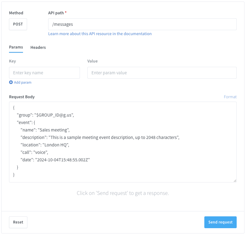 body: '{"group":"$GROUP_ID@g.us", "event":{"name":"Sales meeting", "description":"This is a sample meeting event description, up to 2048 characters", "location":"London HQ", "call":"video", "date":"2024-09-23T13:01:17.020Z"}}'