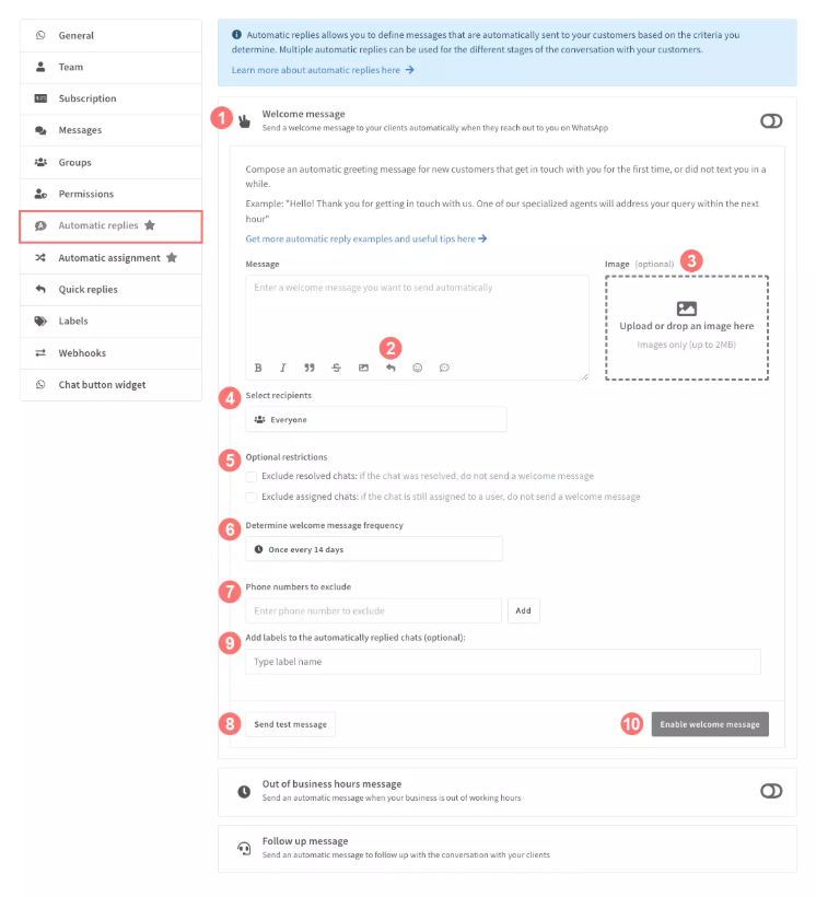 - Click on ‘Enable welcome message’ to activate this specific automatic reply.