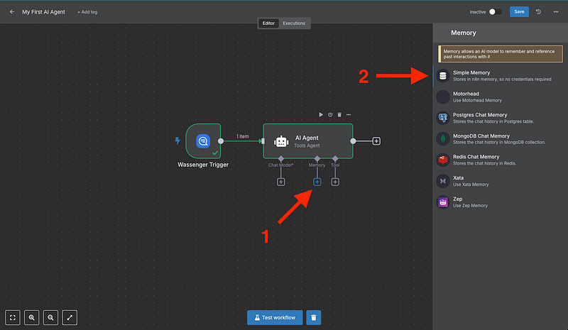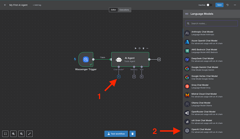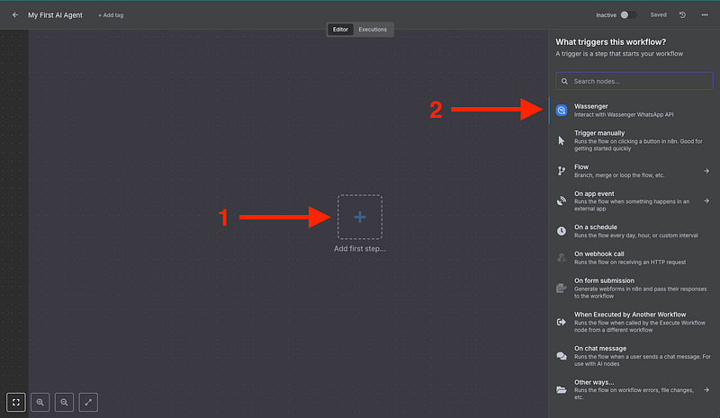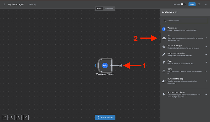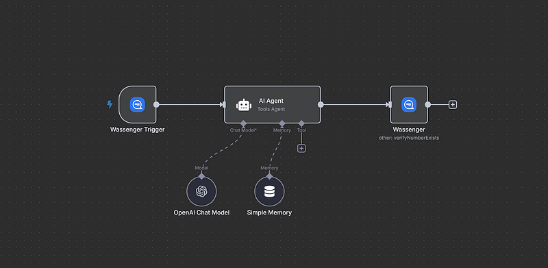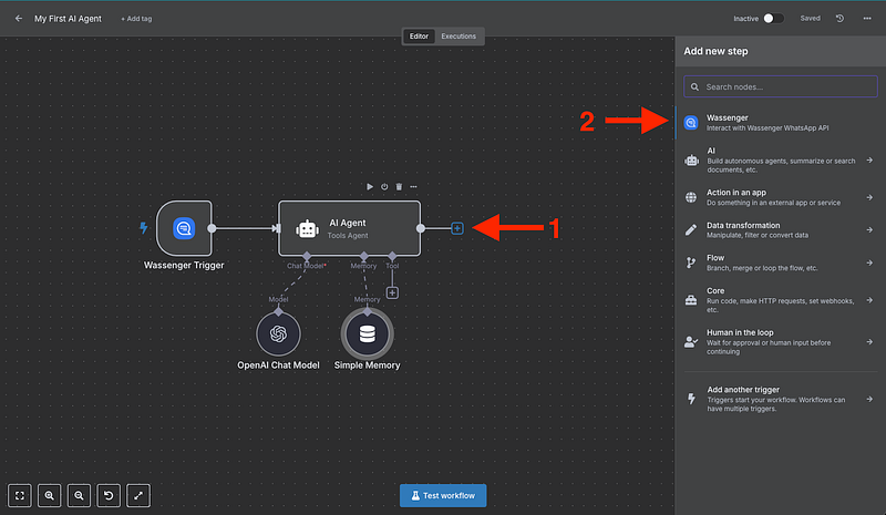 Now, as the last step of your first WhatsApp AI Agent, add the Wassenger Message Send Node.