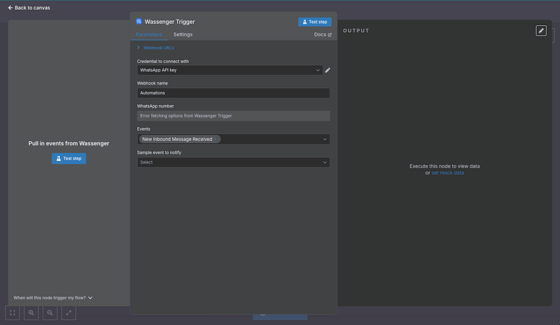 {{ $(‘Wassenger Trigger’).item.json.data.fromNumber }}as an expression for the target number - Add