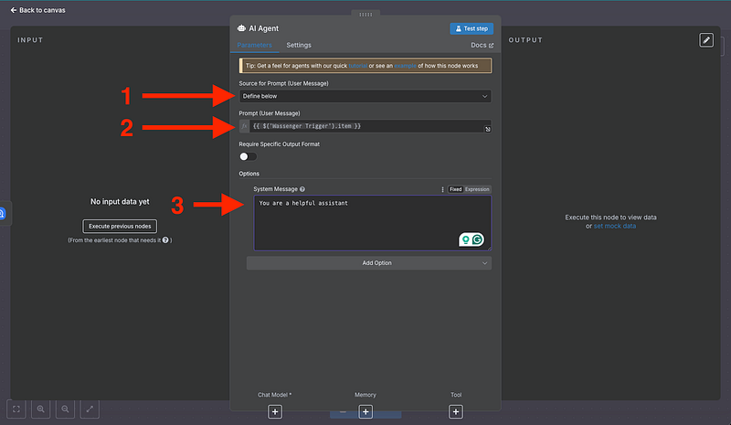- You will need to select ‘Define Below’ for the Source for Prompt (User Message)