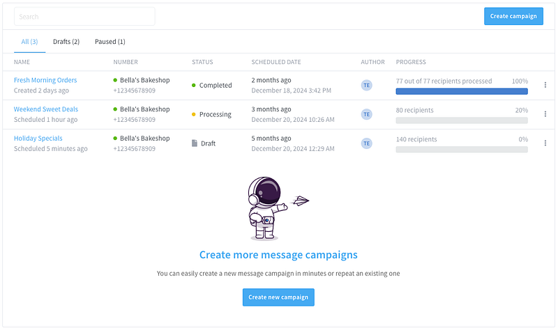 - Step 2: Bella created her first campaign using Campaigns to send bulk messages without technical skills.