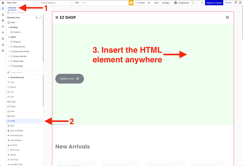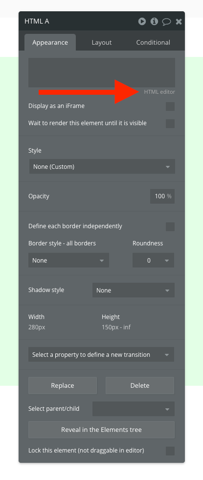 After clicking the page, the HTML element will show up, and we will click on ‘HTML editor’